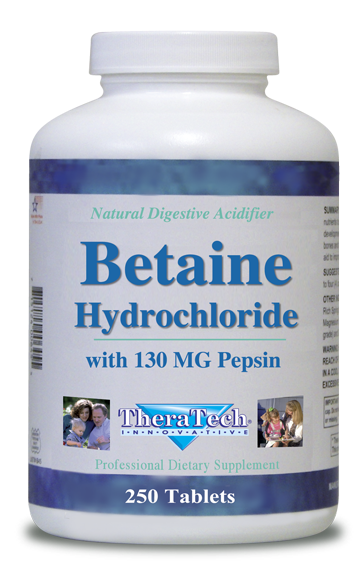 Betaine hydrochloride (HCL) is an inorganic compound produced by the parietal cells in the mucosal lining. Hydrochloric acid breaks down proteins, activates important enzymes and hormones, and maintains a sterile environment in the stomach. It also facilitates the absorption of a number of nutrients, including folate, vitamin B12, ascorbic acid, beta-carotene, iron, and some forms of calcium, magnesium, and zinc.*